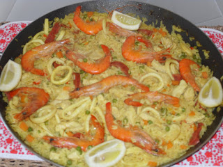 Na paellera, refoguei a cebola e o alho num pouco de azeite. Depois acrescentei os peitos de frango (que ficaram a marinar durante a noite) cortados em tirinhas. Acrescentei depois metade do pimento vermelho cortado aos cubos, a cenoura também cortada aos cubos e as ervilhas. Refresquei com um pouco de caldo de frango e com o açafrão. Depois acrescentei as rodelas de lulas e mais caldo de frango, quando começou a borbulhar acrescentei o arroz e fui acrescentando caldo até o arroz estar quase cozido. Por fim, acrescentei os camarões e as rodelas de chouriço e deixei cozer por mais 5 min.