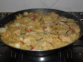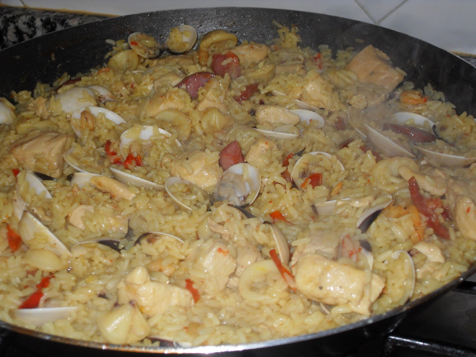 Numa paellera, aquecer o azeite e alourar o peito de frango cortado às tirinhas. Quando este estiver lourinho, acrescentar a cebola picada, o alho e o pimento. Deixar cozinhar alguns minutos e acrescentar as lulas cortadas às rodelas, acresecntar um pouco de caldo de galinha e deixar cozinhar mais uns minutos. Acrescentar o arroz. Juntar caldo, sempre que necessário e até o arroz estar cozinhado. Entretanto, acrescentar as rodelas de chouriço, as ameijoas e retificar os temperos (sal, pimenta e piri-piri).