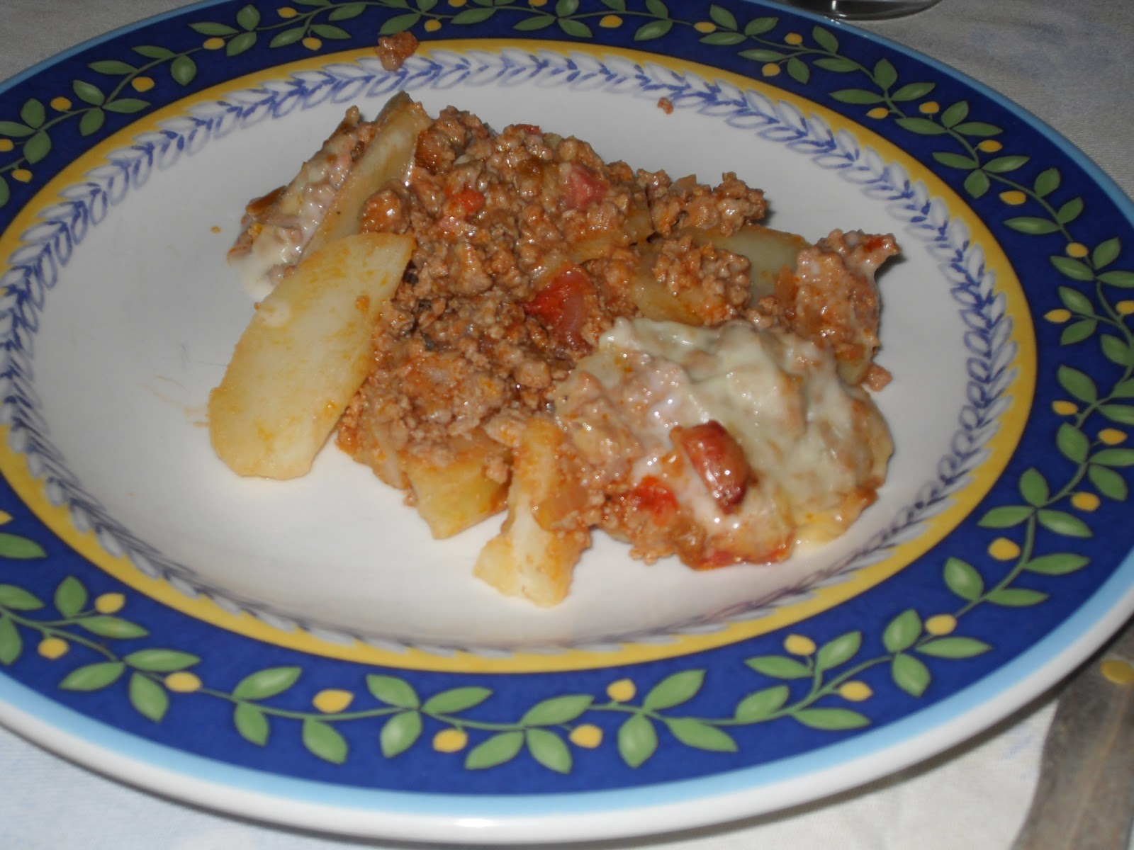 Barrar um tabuleiro de ir ao forno com a manteiga, colocar uma camada de batata, de seguida uma camada de carne picada, repetindo até acabar os ingredientes.